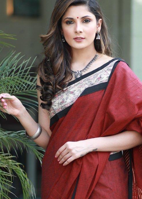 Handloom cotton saree with handpainted madhubani painted border & ajrakh block printed pleats