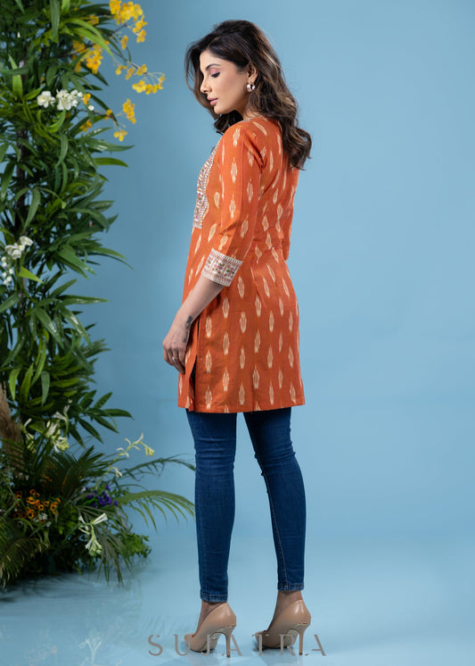 Elegant orange cotton ikat jacket with madhubani combination and optional embroidered inner
