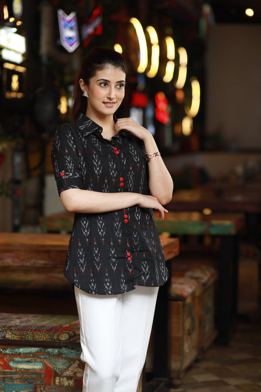 Evergreen Black Ikat Casual Shirt With Elbow Sleeves & Red Buttons