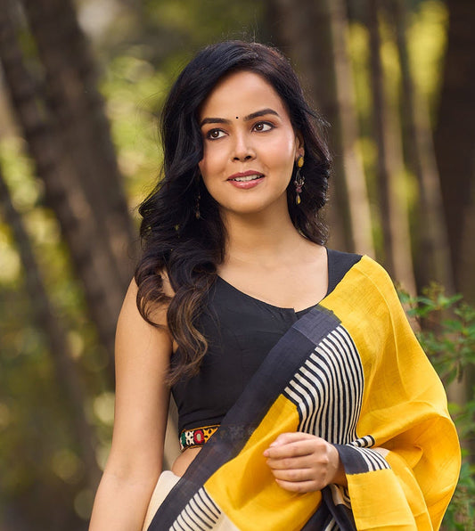 Handcrafted Off-White Pure Cotton Hakoba Blouse with Intricate Paisley Weaves and Mirror Work Lace