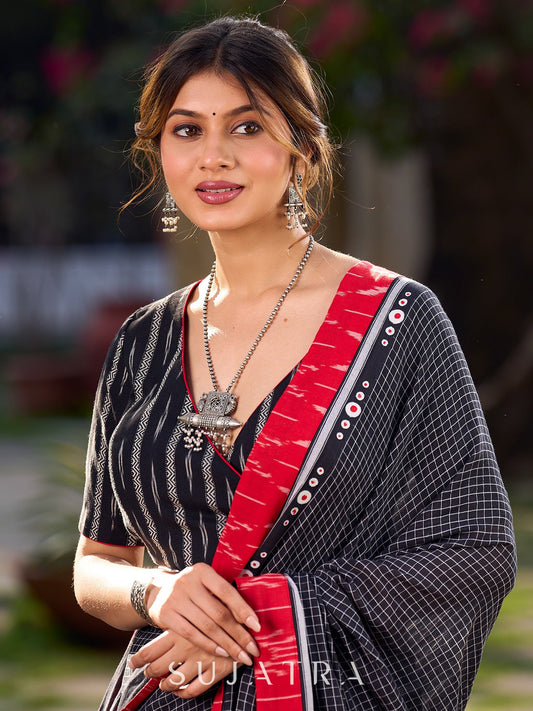 Black Ikat Cotton Blouse with Highlighted Neckline