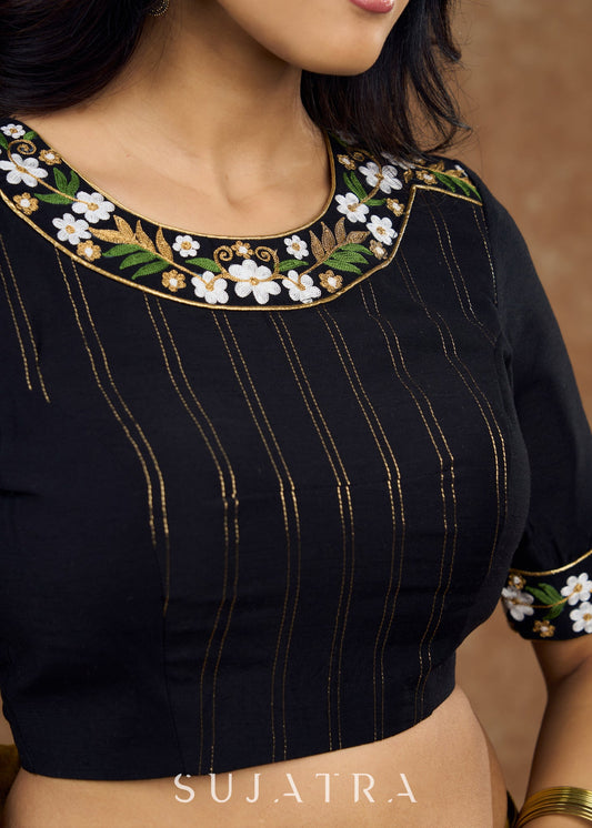 Elegant black Cotton silk blouse with beautiful floral embroidery