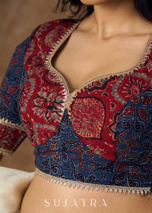 Timeless elegance : Blue Ajrakh blouse with intricate kalamkari , Ajrakh & brocade details - true masterpiece of traditional craftsmanship