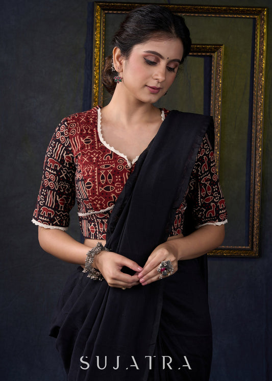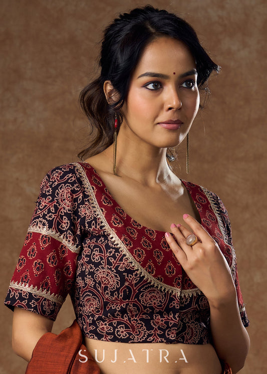 Graceful black & Maroon floral ajrakh blouse with golden lace work