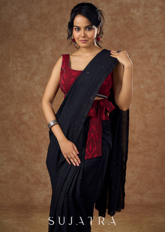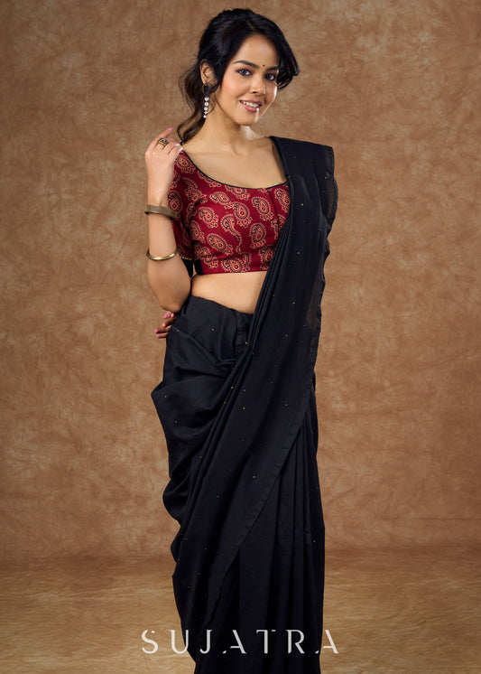 Striking half and half Ajrakh blouse combining maroon & black hues elevated by intricate coin work .
