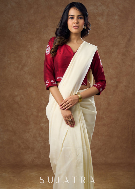 Embroidered Scalloped off White Cotton Silk Blouse - Optional Plain Saree