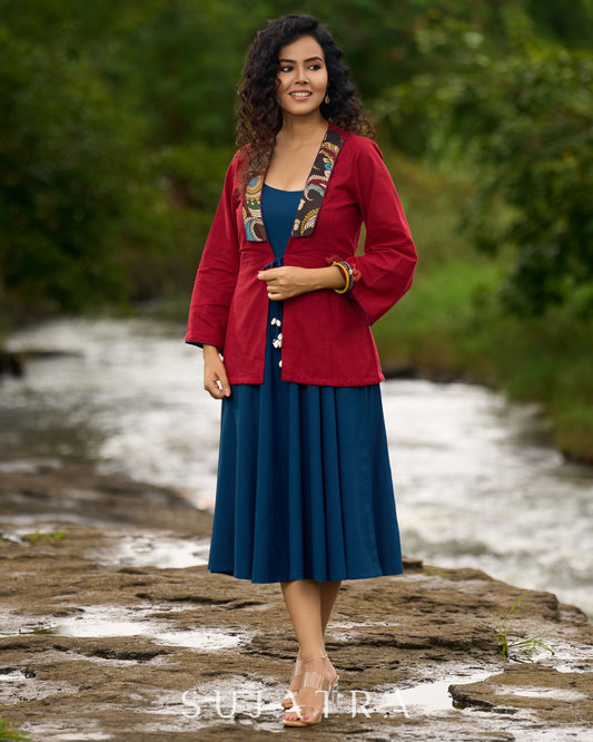 Festive Red Kalamkari Jacket with Shell Tassels – Styled with Rayon Dress