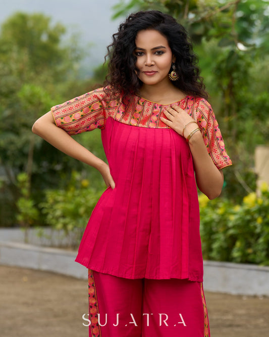 Blush Brocade Pleated Cotton-Silk Top with Additional Slit Pants