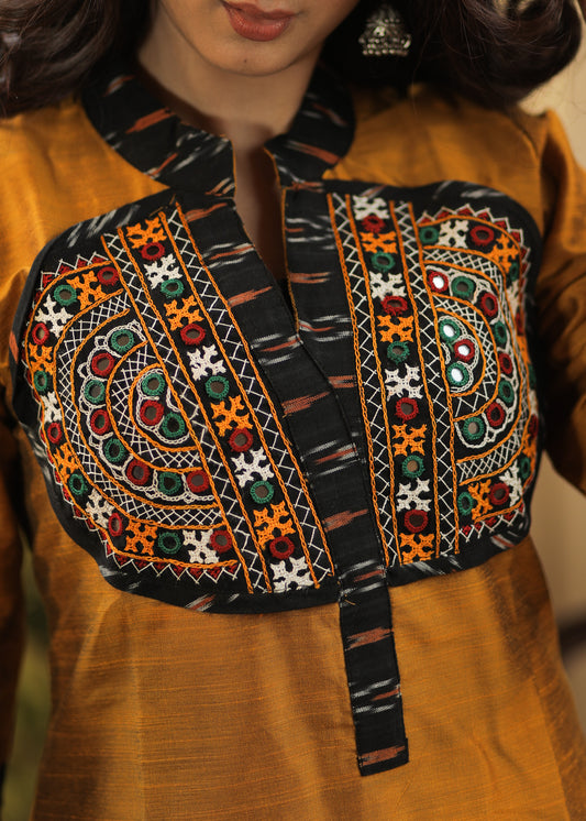 Straight cut Mustard Cotton Silk Kurta with Exclusive Hand made Kutch Mirror work and Ikat