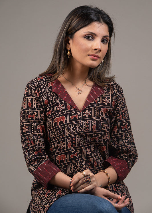Black animal print Ajrakh pure cotton top with Ikat collar and cuff