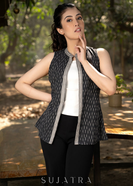 Elegant black cotton ikat sleeveless jacket with mandarin collar