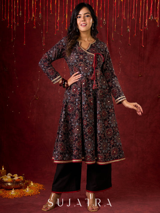 Timeless Black Ajrakh Flared Anarkali with Subtle Artisanal Hand Embroidered Touch