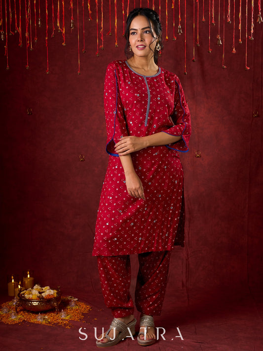 Hand-Embroidered Rayon Bandhani Kurta - Salwar n applique dupatta optional.