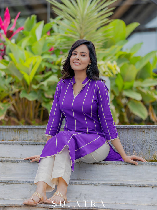 Regal Purple Silk Kurta with Gathered Silhouette & Brocade Accents