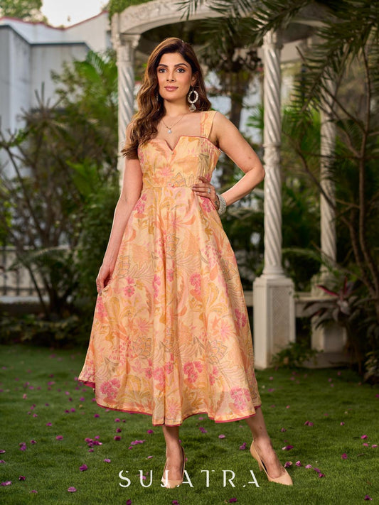 Effortless sunshine yellow floral dress designed with a delicate neckline, gathered straps, and a breezy, flowy form.