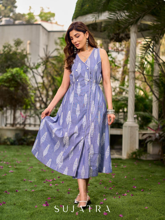 Graceful powder blue Ikat dress showcasing layered overlap details highlighted with white accents.