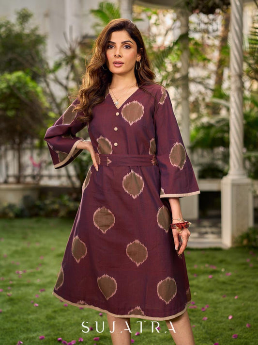 Elegant wine-purple Ikat dress with flowy sleeves, finished with a belt for a softly cinched silhouette.