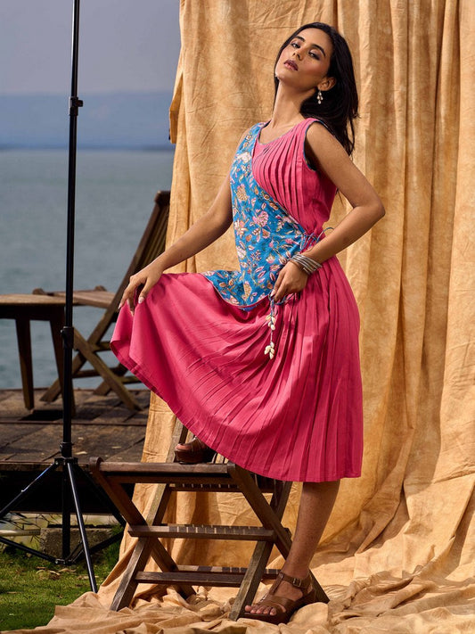 Rose Pink Pleated Wrap Dress with Embroidered Blue Panel