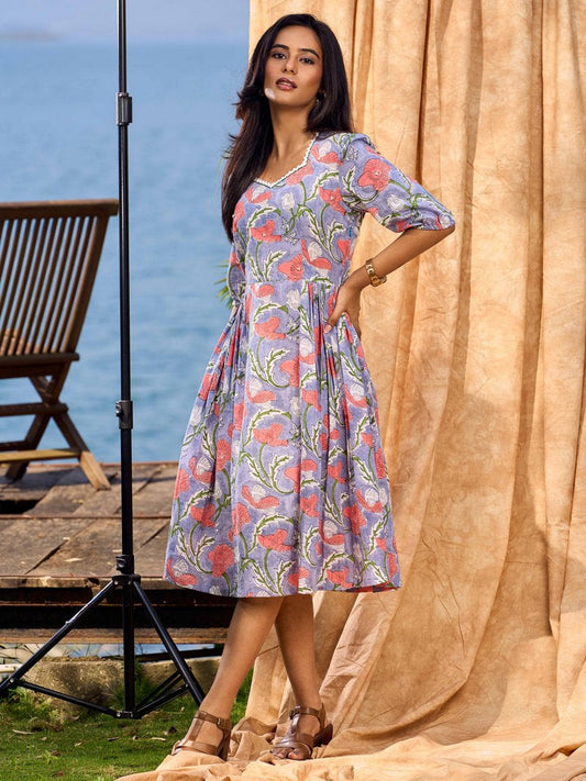 Lilac Bloom Cotton Pleated Dress With Scarlet Floral Print