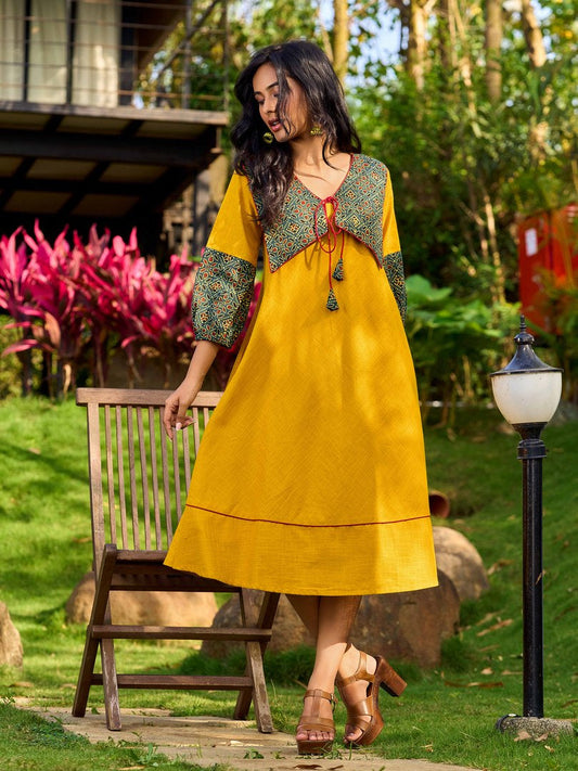 Handcrafted Mustard Cotton Flared Dress with Contrasting Ajrakh Collar