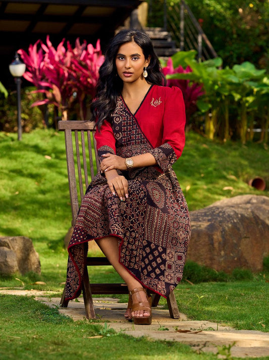 Indie Charm Maroon & Black Ajrakh Patchwork Print Dress