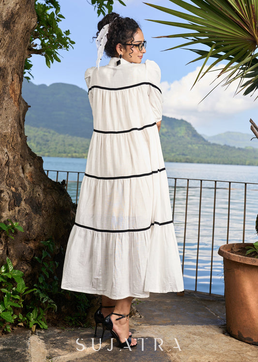 Graceful white cotton flared one piece dress highlighted with velvet lace
