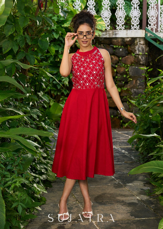 Stylish red cotton halter neck dress highlighted with mirror embroidery on yoke