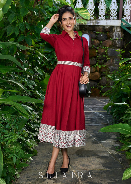 Graceful maroon cotton collared dress with floral combination & belt