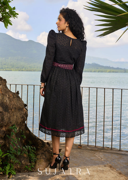 Graceful black Hakoba one piece dress highlighted with embroidered belt and embroidered lace
