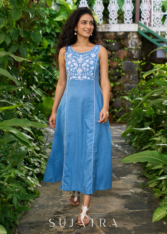 Classy powder blue cotton sleeveless dress highlighted with floral embroidery on the yoke