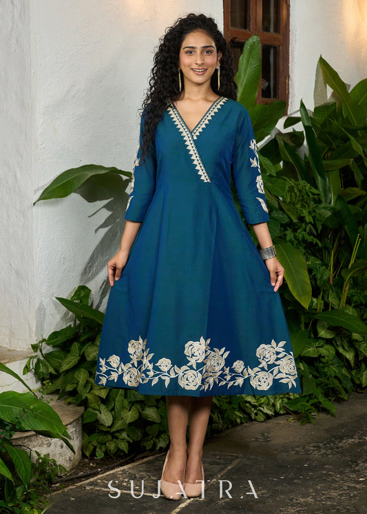 Classy teal cotton silk one piece dress with bold floral embroidery