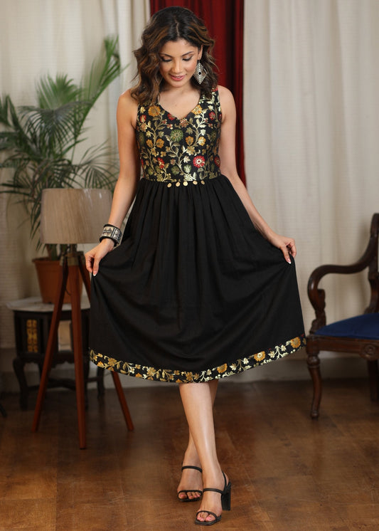 Beautiful Black Cotton Dress With Kutch Mirror Work Pocket
