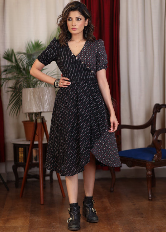 Elegant black ikat and katha work overlap dress highlighted with beautiful wooden buttons
