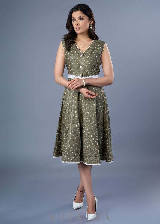 Floral print V neck gathered dress with attached belt and coin embellishments