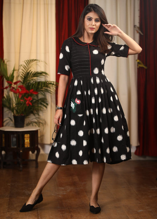 Authentic double ikat polka dotted dress with embroidered motif on pocket