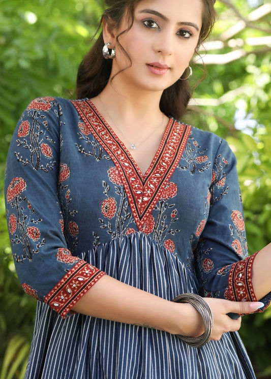 Classy Indigo and Ajrakh V-Neck Fit and Flare Dress