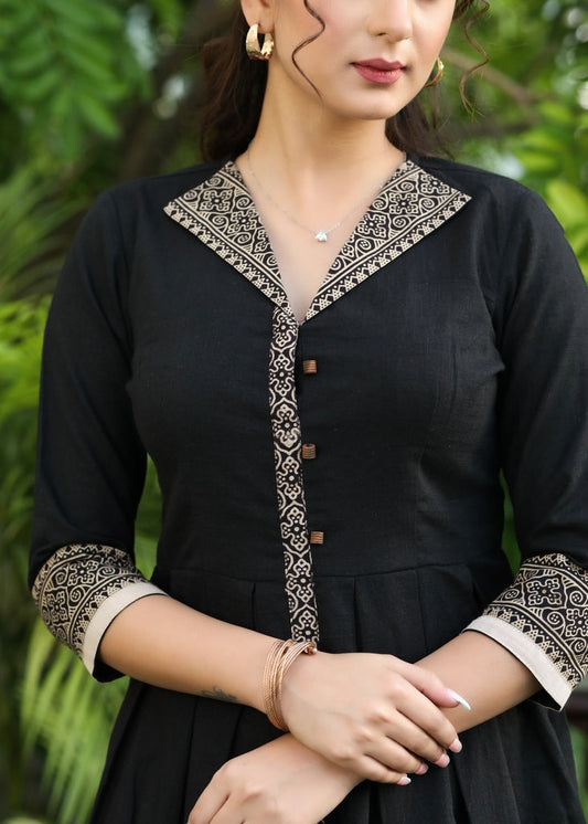 Beautiful Black Cotton Ajrakh Dress with Ajrakh Neckline and Sleeves