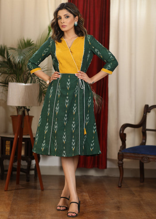 Beautiful Overlap Beige Dress with Ikat Border and Sequence Work