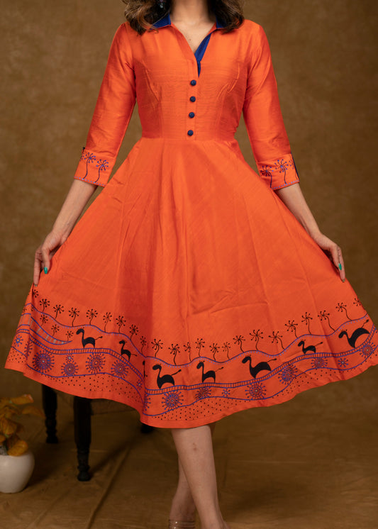 Exclusive Orange Cotton Silk Dress with Gond Painting on Hemline and Sleeves
