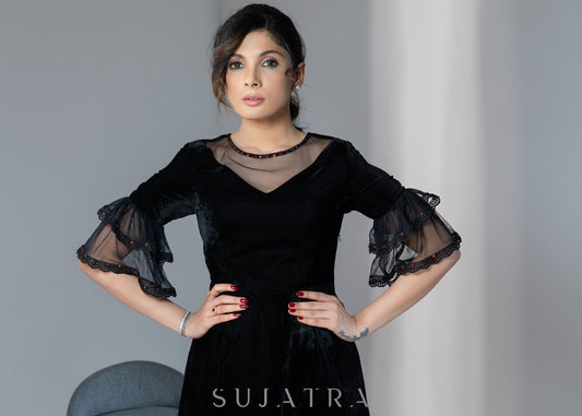 Party wear black velvet dress with net sleeves & red stone work detailing on the neck