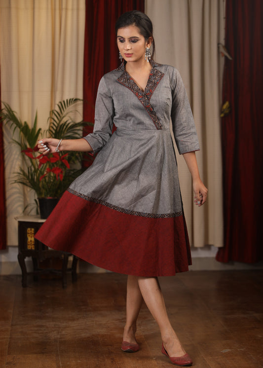 Grey & maroon combination handloom cotton dress with Ajrakh collars