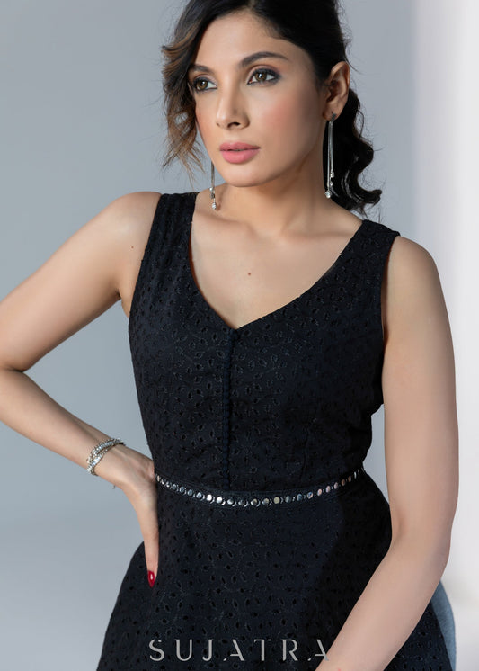 Casual black hakoba sleeveless dress with mirror work border on hem & waist