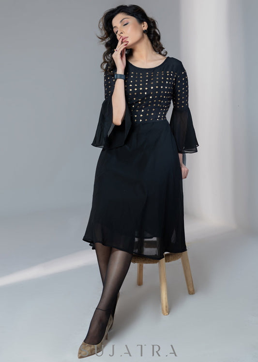 Black Georgette Shrug Dress with Hand Mirror Work All Over and Magenta Inner in Contrast -2 Piece (Shrug & Dress Set)