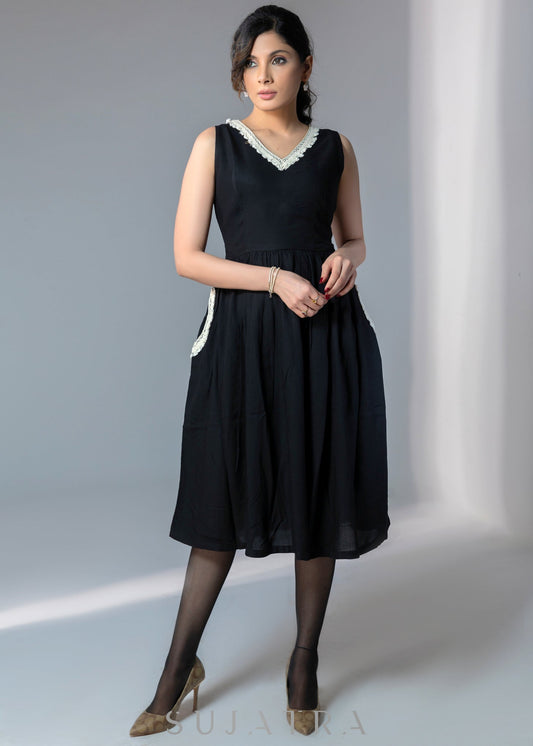 Black sleeveless rayon dress with off white lace detailing on neck and pockets
