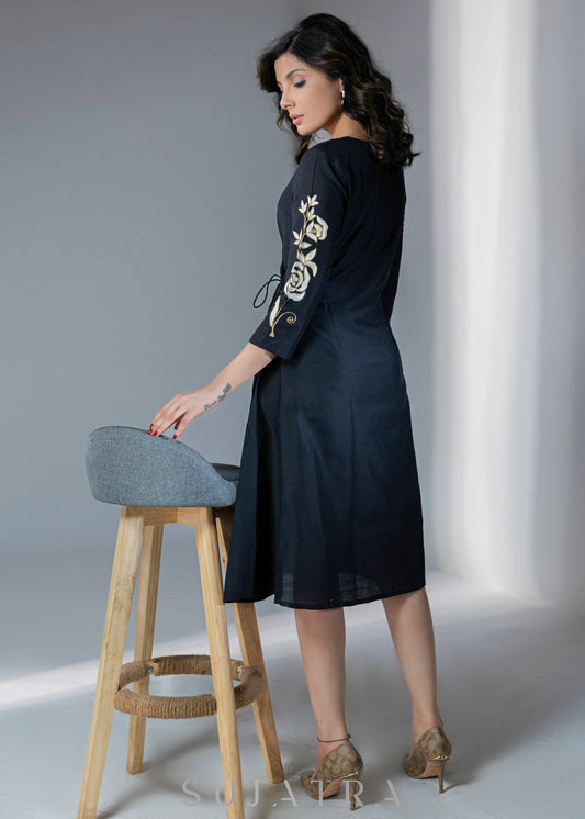 Beautiful black cotton silk A-line dress with magenta embroidery