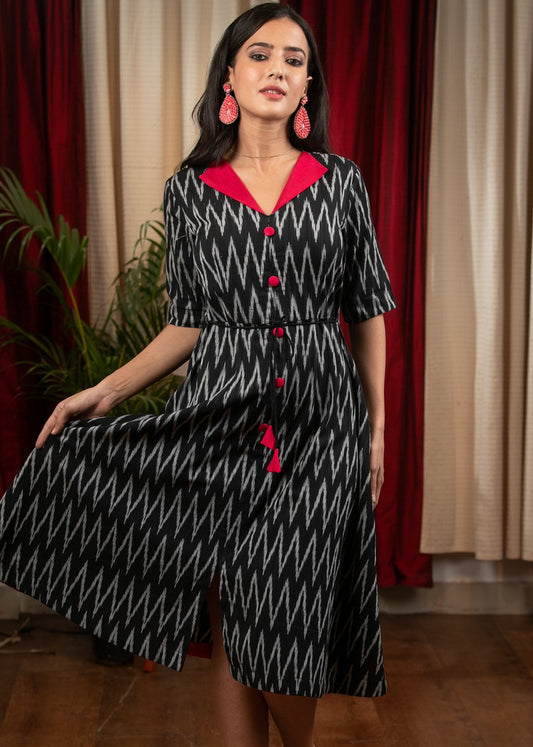 Black ikat dress with red silk collar