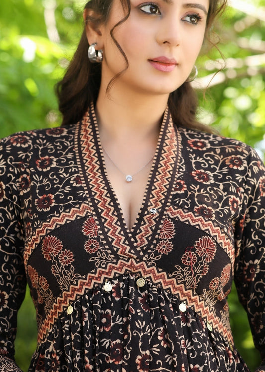 Exclusive V-Neck Fit and Flare Black Ajrakh Dress