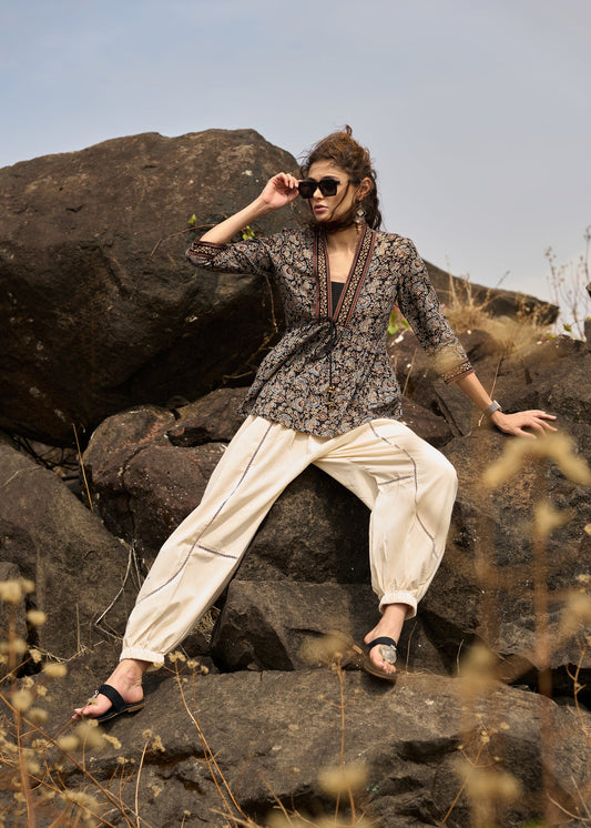 Trendy Black Indo-Western Ajrakh Formal Skirt with Optional Cotton Shirt