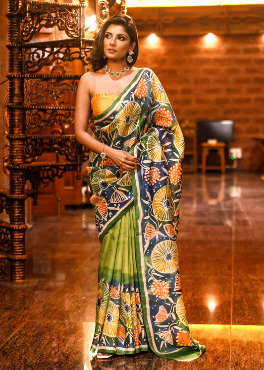 Green pure bishnupuri silk saree with exclusive hand batik work