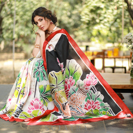 Elegant Off-white Pure Silk Batik Saree with Fusion Handpainting